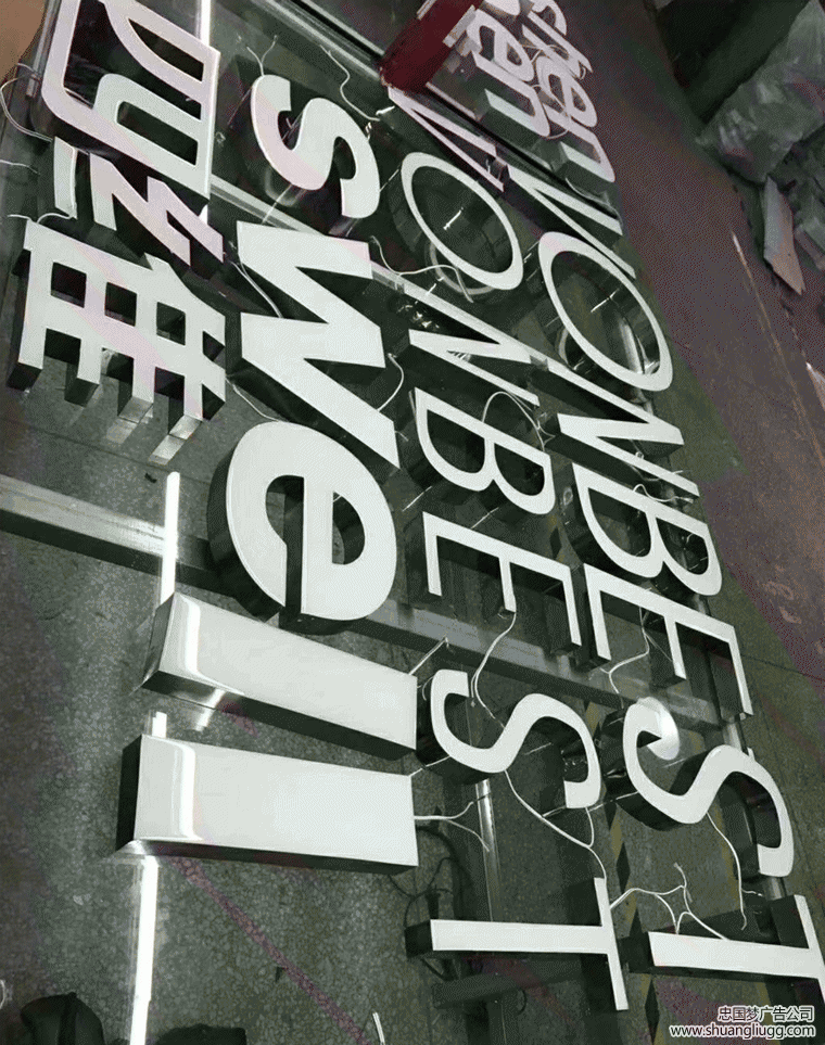 双流广告制作新型树脂字因为受到灌树脂的要求,所以必须是底壳要做到很精致,也就是说新型树脂发光字就是原来精品金属字结合新的LED光源及新型树脂材料的完美搭配。
